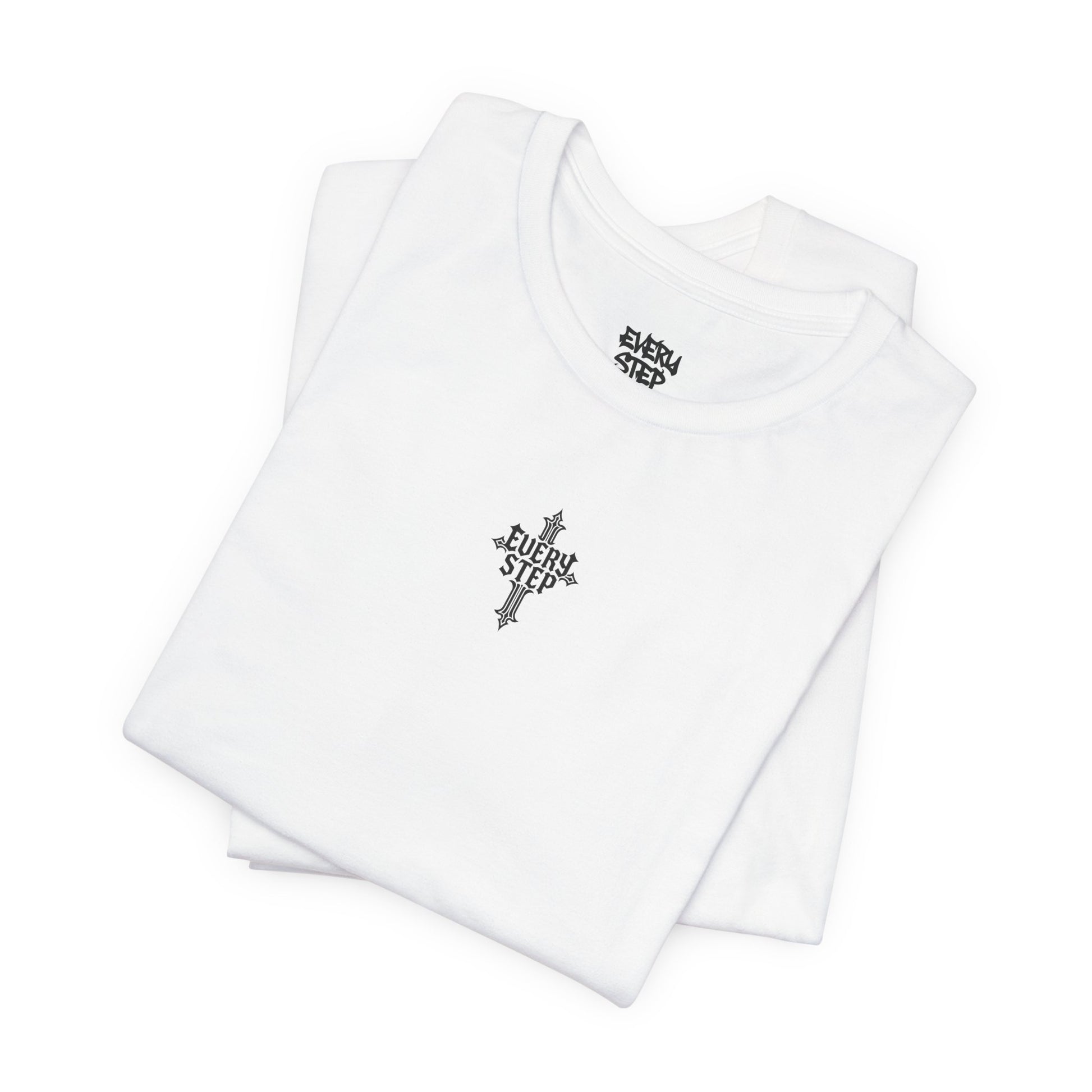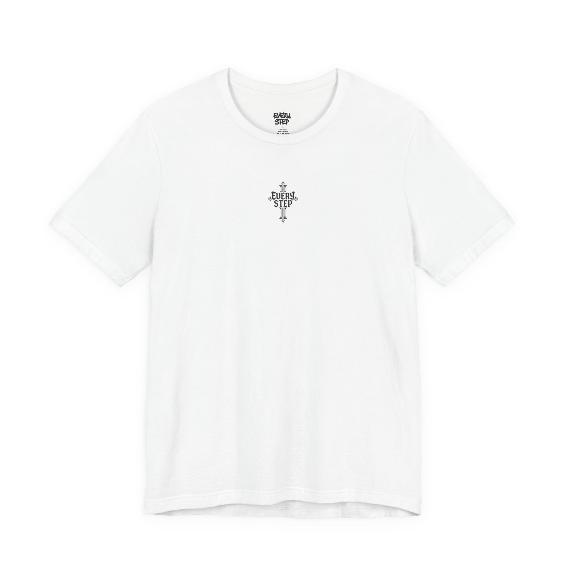 Soft, breathable cotton meets bold, understated symbolism. This lightweight jersey tee wears like a quiet statement: a small gothic emblem on the chest and a larger, striking cross-shaped wordmark on the back that reads “EVERY STEP.” It’s the kind of shirt that slips into day-to-day life — layered under a jacket, worn with worn-in jeans, or folded into a travel bag — while carrying a steady, grounded message. The fabric feels airy against the skin and holds its shape thanks to thoughtful construction. For someone who moves through city streets, long walks, or reflective moments, this tee blends comfort and clarity without shouting.